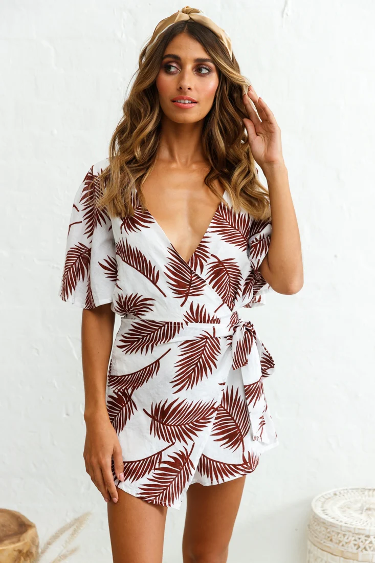 Nadi V-Neckline Wrap Romper Palm Print Wine