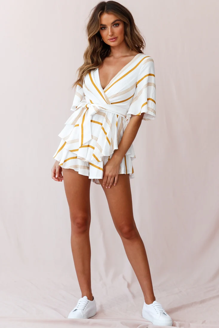 Happy Hour Deep V-Neckline Open Back Romper Stripe Print Mustard