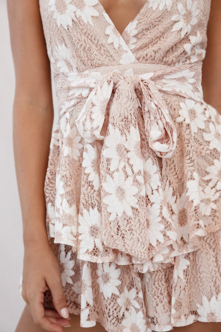 Tenerife Lace Trim Tied Shoulder Strap Romper Beige