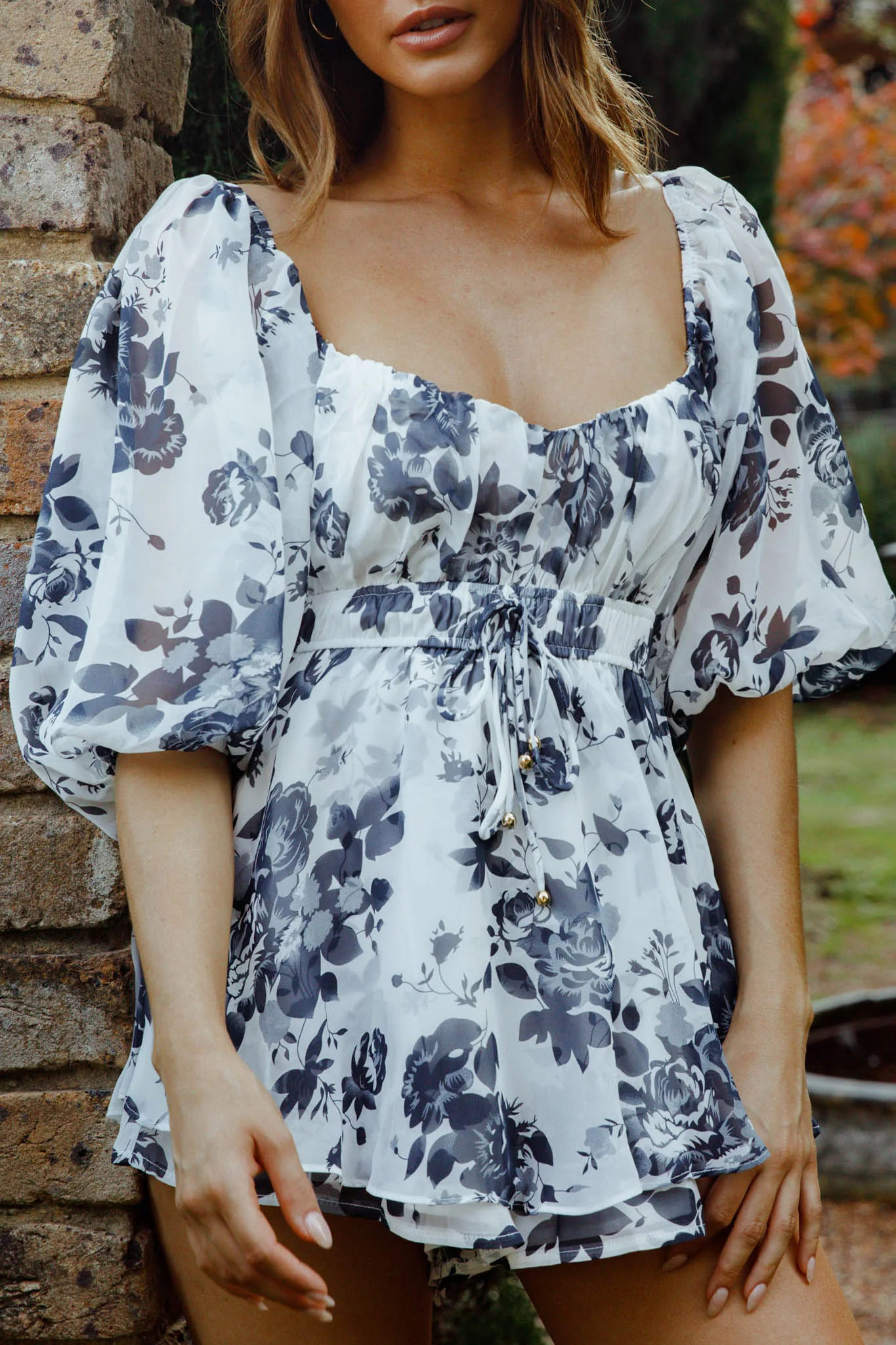 First Light Puff Sleeve Elasticated Waist Romper Floral Print Ink