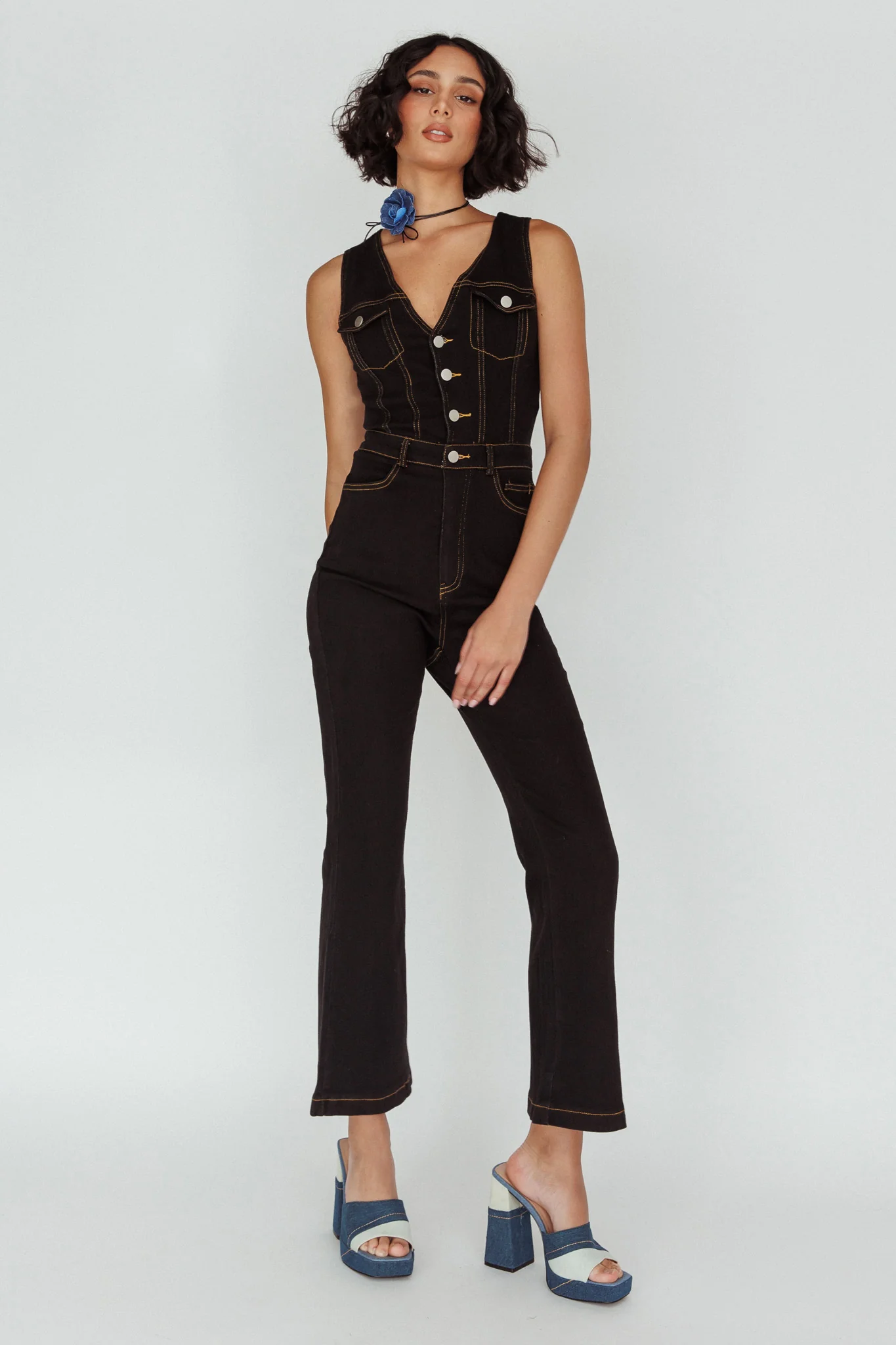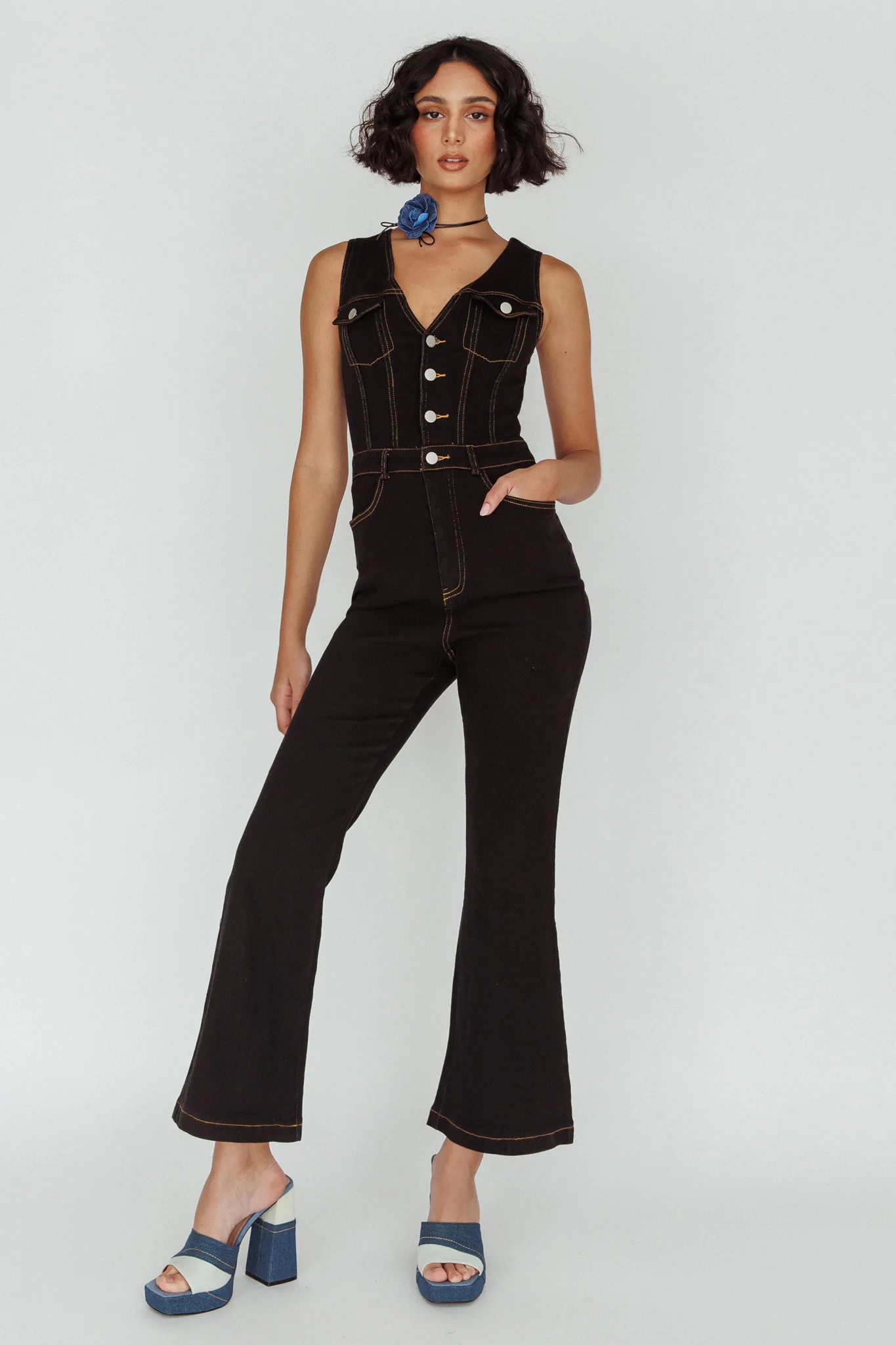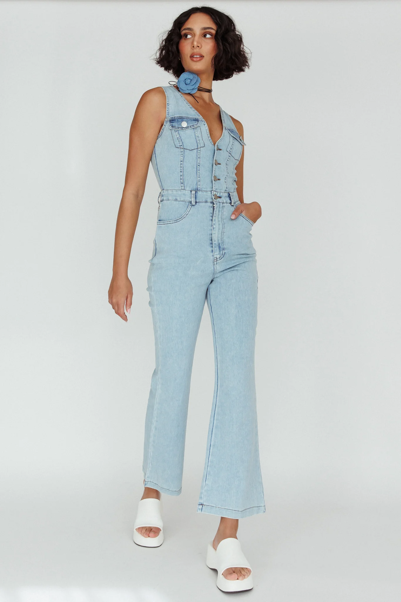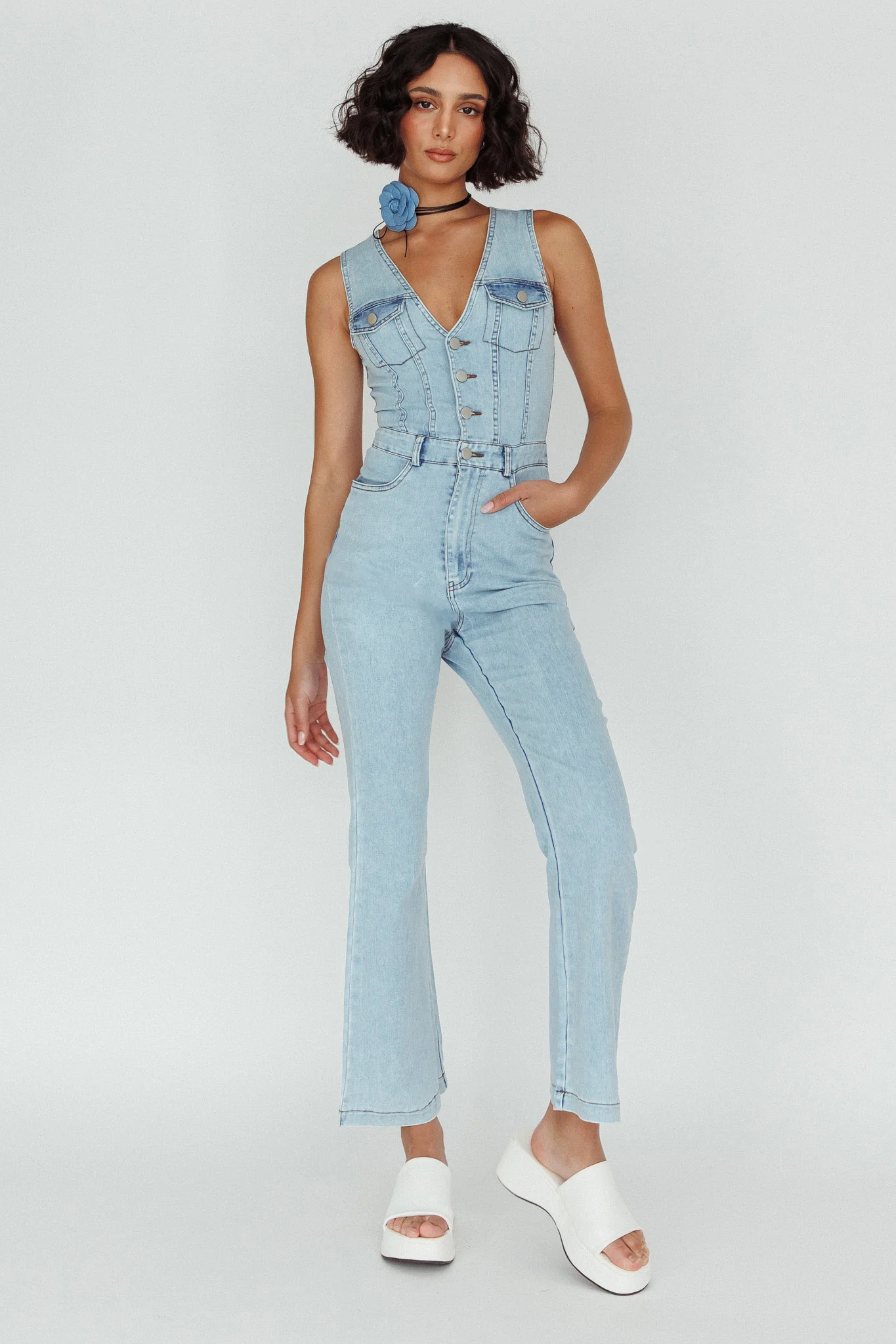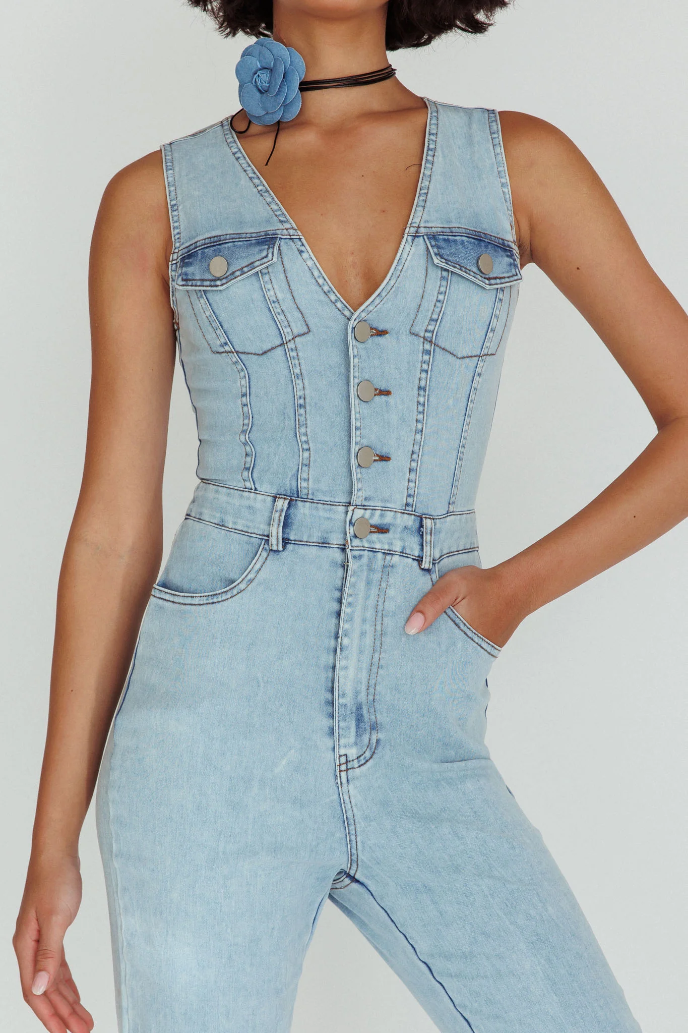 Jazelle Button Front Jumpsuit Washed Blue