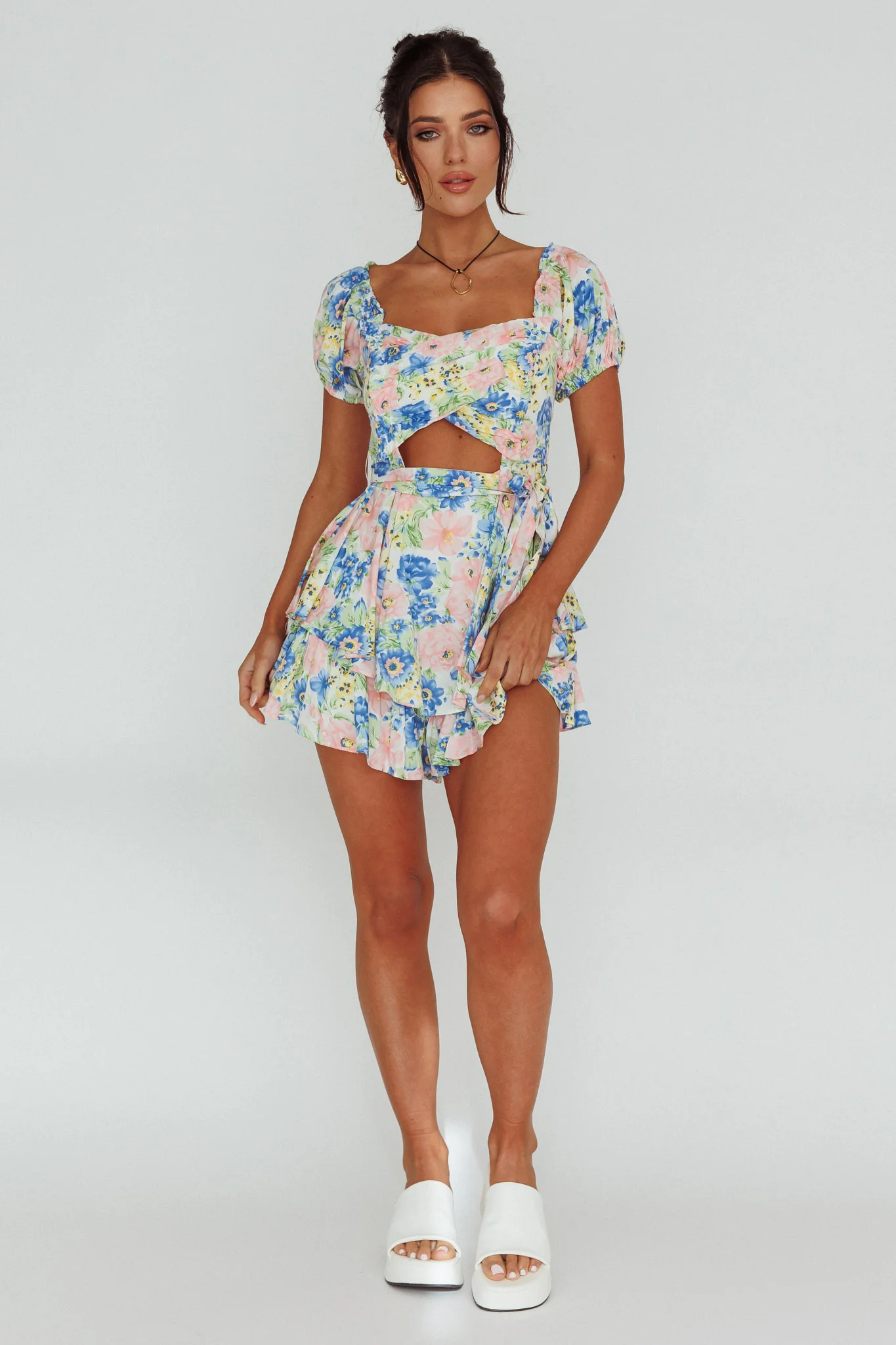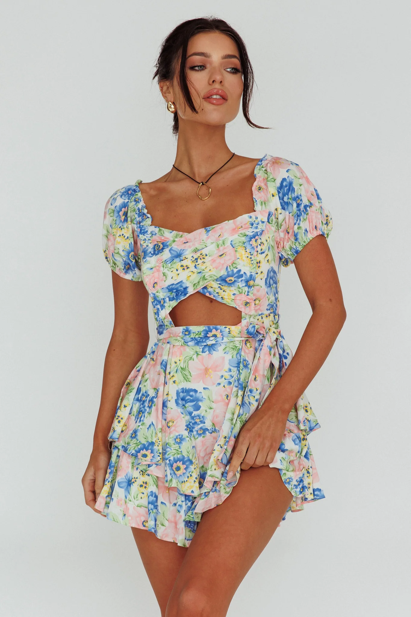 Whimsical Cut-out Bodice Romper Floral Blue