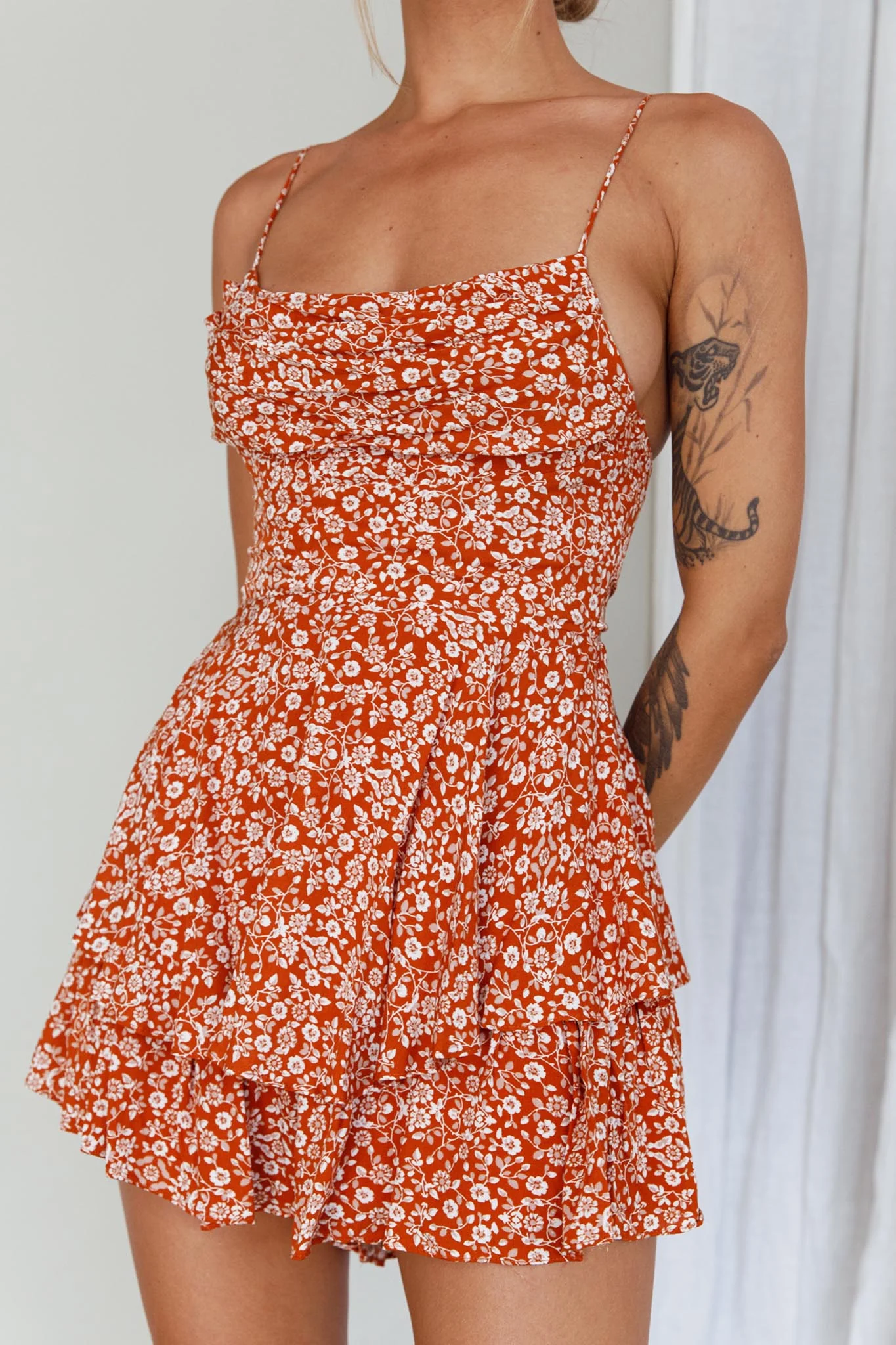 Well Versed Cowl Neck Flounce Romper Floral Orange