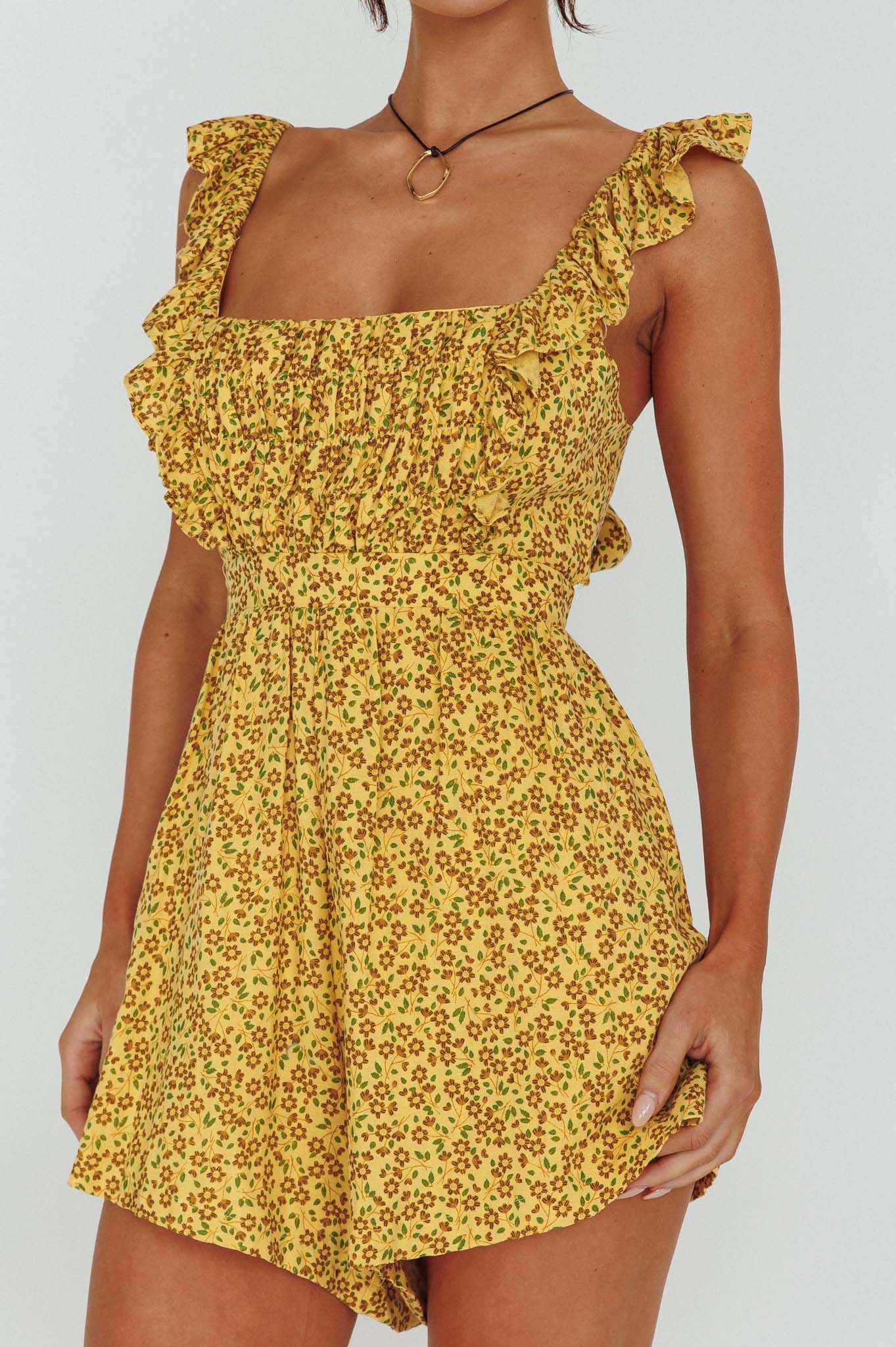 Lazy Sunday Frill Strap Tie-Up Back Romper Floral Print Mustard