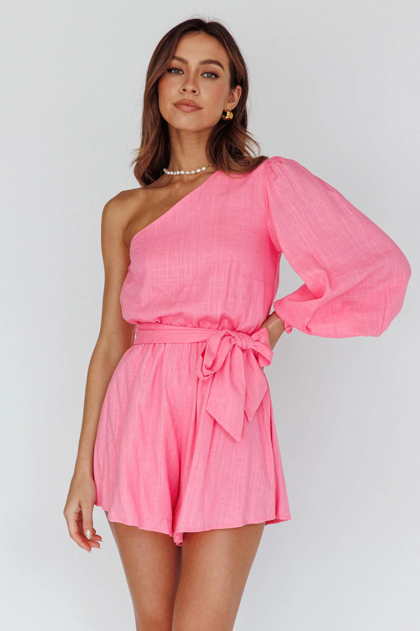 Summer Lover One-Shoulder Long Sleeve Romper Pink